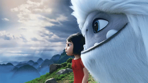 Yi, Jin, and the Yeti from Abominable marvel at a stunning, misty mountain landscape.