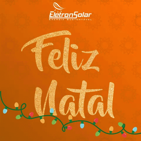 Animated 'Feliz Natal' (Merry Christmas) greeting from Elétron Solar with sparkling golden text and festive lights.