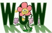 A cheerful cartoon flower with a big smile dances in front of the large green word "WOW".