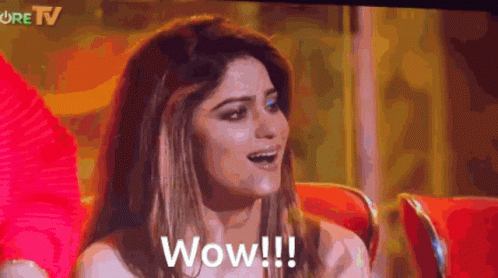 Shamita Shetty reacts with an enthusiastic 'Wow!!!' while sitting on a couch, creating a popular meme.