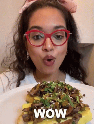 Priyanka Naik, wearing red glasses, reacts with excitement to a plate of delicious food, exclaiming 'Wow!'
