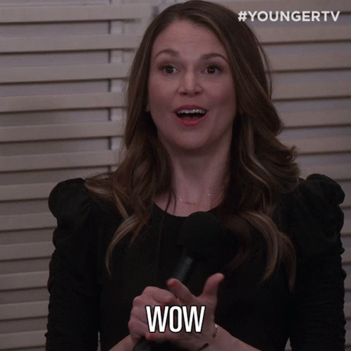 Sutton Foster, portraying Liza Miller from Younger TV, expresses 'Wow' with an amazed expression.