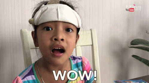 Zara Cute, a little girl with a bandage on her head, reacts with an astonished 'WOW!'