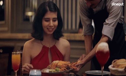 A woman in a red dress is served a delicious lobster dish by a waiter at a restaurant, ready to enjoy her dinner.