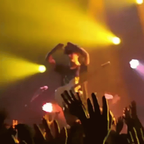 a crowd of people raising their hands in the air at a music concert
