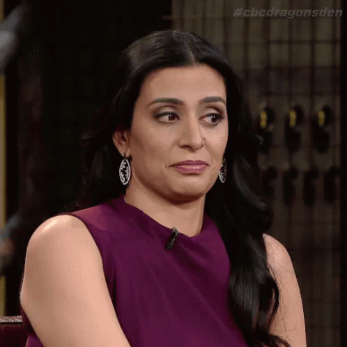 Manjit Minhas from Dragons' Den reacts with a surprised and slightly shocked expression.