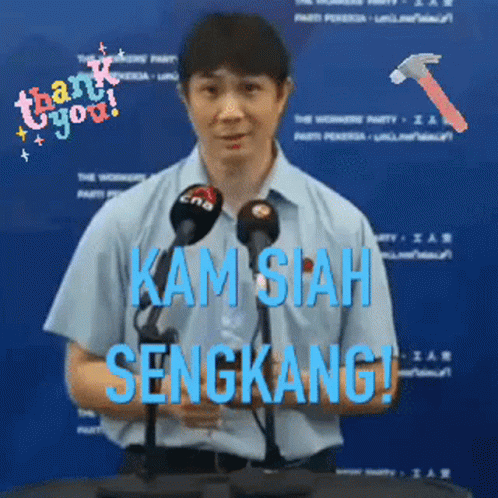 Jamus Lim of the Workers' Party thanks the Sengkang constituency, saying 'Kam Siah Sengkang!'