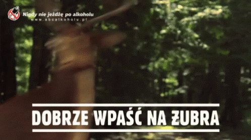 A Polish beer advertisement featuring a bison and its calf, with a message about not driving after alcohol.