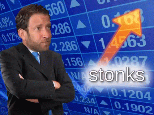 Dave Portnoy in a suit with the 'stonks' meme background, representing bullish market sentiment.