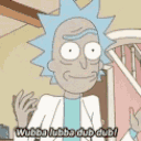 Rick from Rick and Morty exclaims his iconic catchphrase, 'Wubba Lubba Dub Dub!'