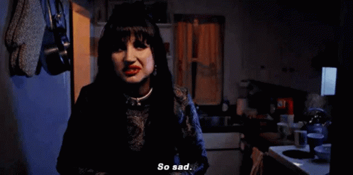 Nadja, played by Natasia Demetriou, looks sad and says 'So sad' in a kitchen scene from What We Do in the Shadows.