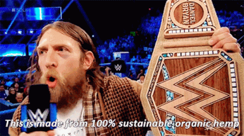 a man with a beard is holding a wooden wrestling championship belt and saying this is made from 100 % sustainable organic hemp