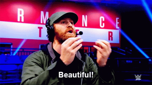Sami Zayn, wearing headphones and a cap, expresses his amazement with a heartfelt 'Beautiful!' in a WWE setting.