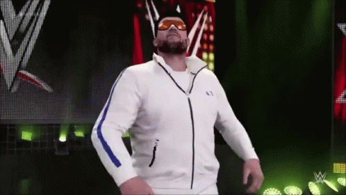 A performer in a white tracksuit and orange sunglasses makes a grand entrance on a WWE stage.