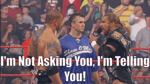 two wrestlers in a ring with the words i 'm not asking you i 'm telling you in the corner