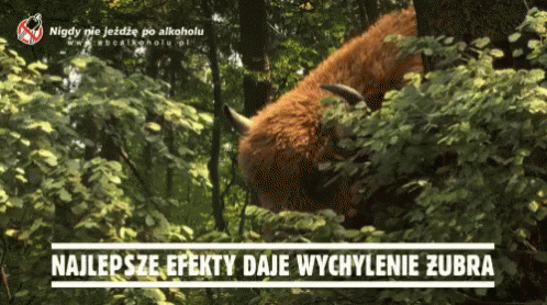 A bison and wolves in the Białowieża Forest, illustrating the 'Zubr's Lean' with a clever play on words related to beer.