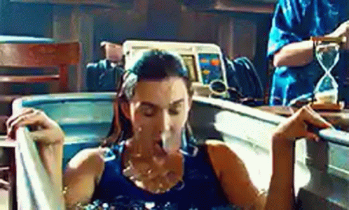 Wynonna Earp reacts with surprise in a cold, icy bath, a scene related to Kedanea from the series.