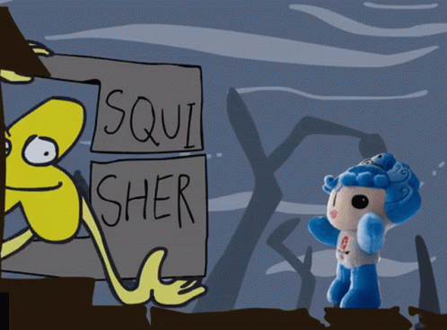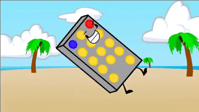 X from Battle For Dream Island holds signs, interacting with a Bei Bei Squisher plush toy in an animated scene.