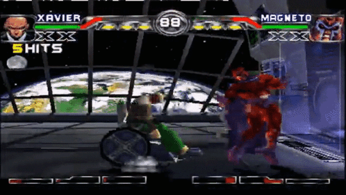 Professor X and Magneto battle in a classic X-Men Mutant Academy 2 fighting game match.