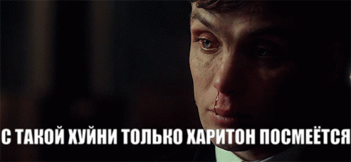 A man, resembling Thomas Shelby, covers his mouth with his hand, with Russian text 'ONLY KHARITON WILL LAUGH AT SUCH NONSENSE' displayed.