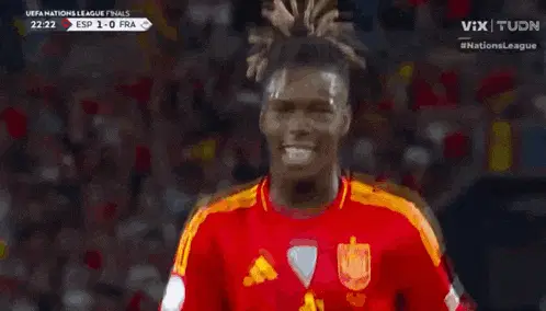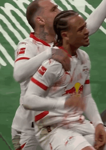 Xavi Simons celebrates a goal or victory with a teammate on the soccer field, both looking excited.