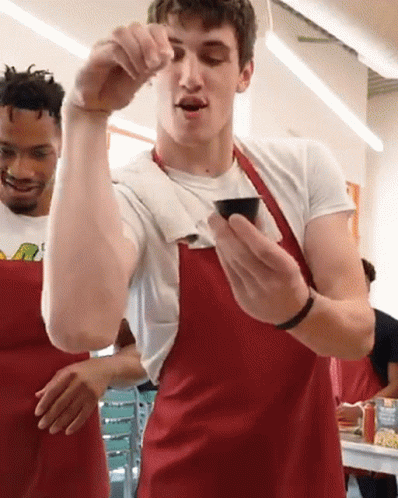 Zach, wearing a red apron, adds ingredients to a pot during a cooking class with Xavier.