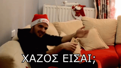 Lorentzo Lp, wearing a Santa hat, smiles on a couch with the Greek caption "Xazos Eisai" (Are you stupid?).
