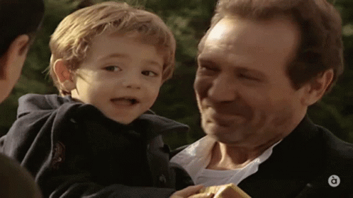 A man, possibly Ximet's grandfather, lovingly holds a young child, Ximet, in Alqueria Blanca.