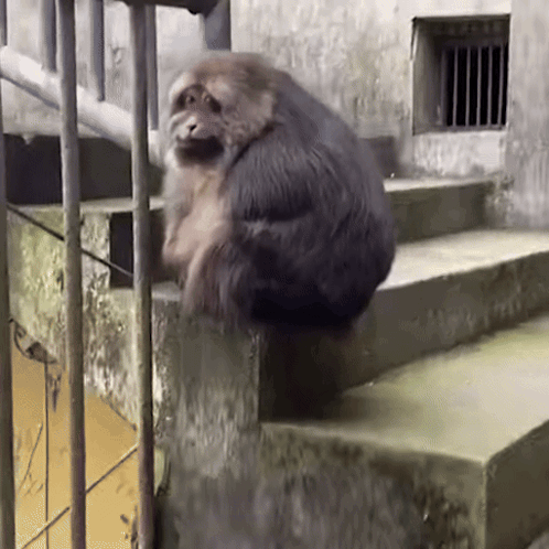 Xing Xingxing, a macaque, sits on concrete stairs, looking directly at the camera.