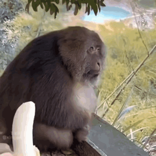 Xingxing Monkey reacts with a side-eye as a hand offers a peeled banana, contemplating the treat.