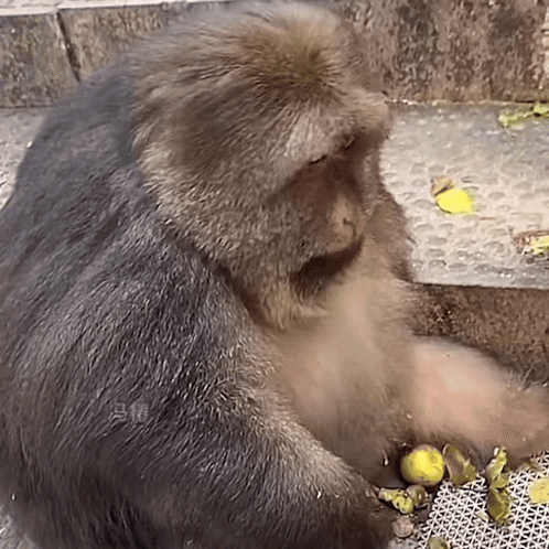 Xingxing the monkey sits on steps, intently eating small yellow fruits.
