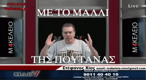 Stefanos Chios passionately speaks on camera, with the bold Greek text 'ΜΕ ΤΟ ΜΑΛΛΙ ΤΗΣ ΠΟΥΤΑΝΑΣ' displayed.