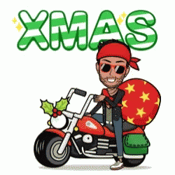 Cartoon character on a motorcycle with a gift bag, celebrating Xmas.