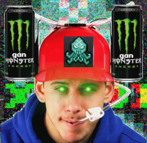 Man in red hard hat with octopus logo, glowing eyes, surrounded by Monster Energy cans.