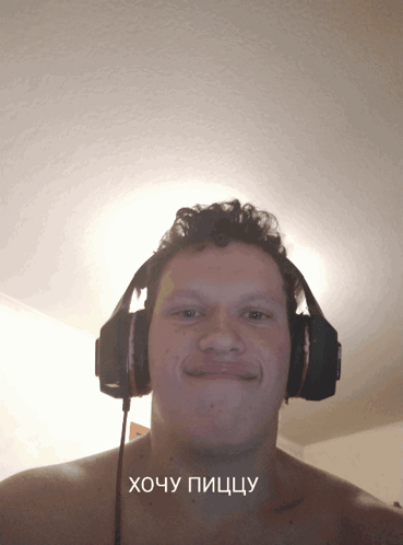 Bogdan 'Valakas' GladiatorPWNZ, shirtless and wearing headphones, expresses his desire for pizza.