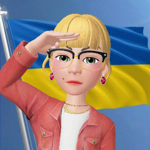 Animated character ходос salutes with a determined expression in front of a vibrant Ukrainian flag.
