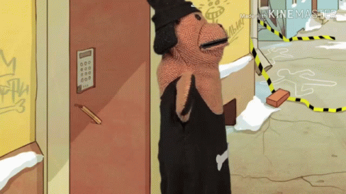 A sock puppet character says 'Gooooood' in a cartoon hallway with crime scene elements and a KineMaster watermark.