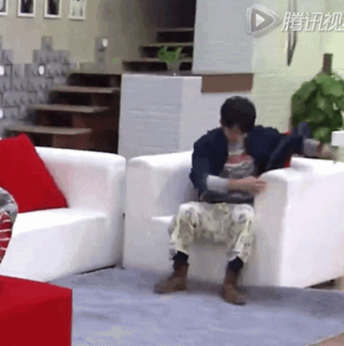 Xz performs a comedic bit, awkwardly sitting and then adjusting on a white couch in a living room.