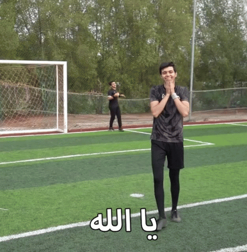 Bashar Arabi on a soccer field, reacting with 'Ya Allah' (Oh God) in an emotional moment.
