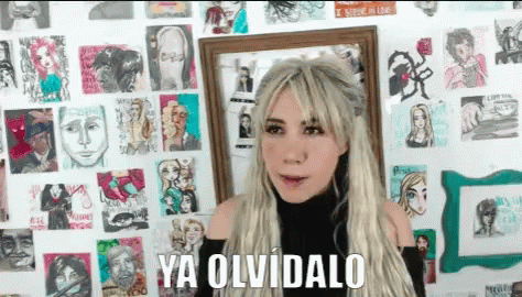 Maire Wink saying 'Ya Olvidalo' (Forget It) while standing in front of a wall covered with her artwork.