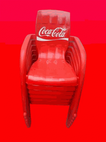 A stack of red Coca-Cola branded chairs is shown, accompanied by Spanish text about donating chairs for a lady to sit.