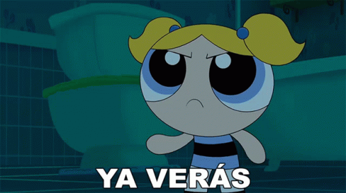 Burbuja from Las Chicas Superpoderosas, looking angry and saying 'Ya Verás' in front of a toilet.