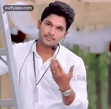 Allu Arjun from Son of Sathya Murthy, wearing a white shirt and headphones, making a hand gesture.