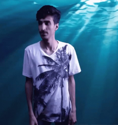 Young man reacts with shock and fear, hands to face, wearing a white t-shirt with palm trees.