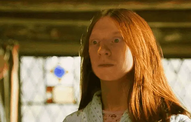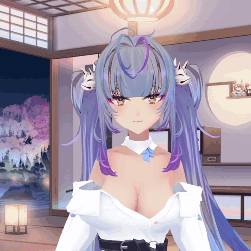 a girl with purple hair is standing in a room with a window