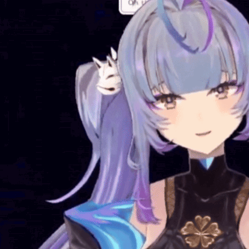 a close up of a girl with purple hair and a fox ear