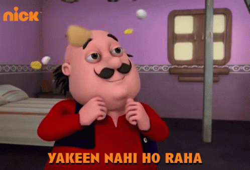 Motu Patlu character Motu reacts with disbelief, saying 'Yakeen Nahi Ho Raha'.