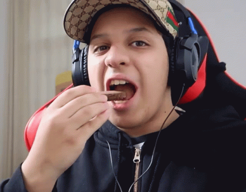 King Madness enjoys a chocolate bar while wearing headphones and a Gucci hat.