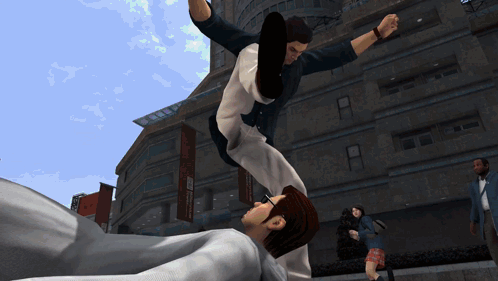 a man kicks another man in the face in front of a building with a sign that says ' a ' on it