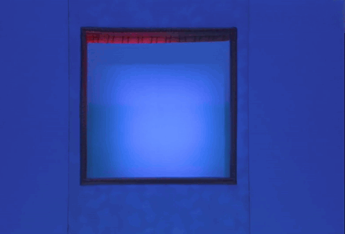 a woman is looking out a window with a blue light behind her